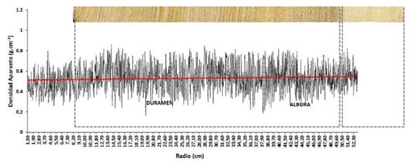 Los valores radiales de la densidad aparente del leño que fueron obtenidos por el software QMS originaron un archivo DAT (el cual contiene los valores puntuales de densidad aparente de las muestras). El archivo fue leído por el software Excel®, con este se realizaron los gráficos de variación radial de la densidad aparente del leño, así como también la determinación de los valores de densidad aparente en la dirección médula-corteza (Mothe, Duchanois, Zannier y Leban, 1998).