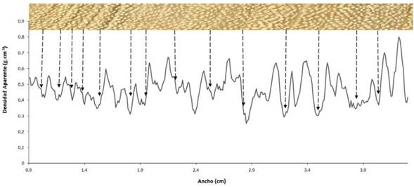 Sobre la demarcación y evaluación del ancho de los anillos de crecimiento de A. cearensis, de acuerdo con Tomazello, Botosso y Lisi (2001), se ha encontrado que es resultado de la estacionalidad de la actividad cambial y de las condiciones climáticas. Esto se refleja en la anatomía y cualidad del leño (Roque et al., 2012). Por consiguiente, la densidad aparente se considera apropiada para definir que el inicio de un anillo de crecimiento sería igualmente apropiado para definir el inicio de la formación de madera tardía (Eberhardt y Samuelson, 2015).