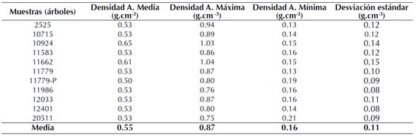 Los valores de densidad aparente de los 11 árboles de A. cearensis al 12% de humedad tuvieron una media, máxima y mínima del leño de 0.55, 0.87 y 0.16 g.cm-3, respectivamente (tabla 1).