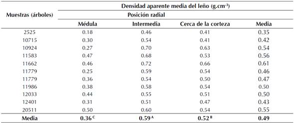 La diferencia en densidad aparente del leño de las posiciones médula, intermedia y cerca de la corteza del tronco fue significativa.