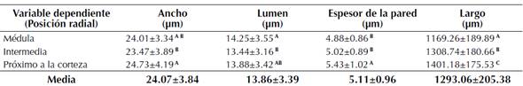 En la anatomía microscópica de los árboles de A. cearensis, en las tres posiciones radiales del leño (médula, intermedia y próxima a la corteza), fueron verificadas diferencias significativas en el largo de las fibras, aumentando estadísticamente (p<0.05) (tabla 3) el largo de las fibras de la más baja en la posición de la médula de (1169.26 µm) hasta la más alta cerca de la corteza de (1401.18 µm), registrándose un aumento de 17% en el sentido radial.