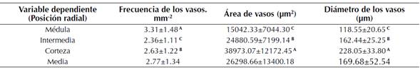 En la frecuencia de los vasos fueron verificadas diferencias significativas, presentando mayor frecuencia de vasos en la posición de la médula, lo que evidencia una caída en la posición intermedia y un aumento en la corteza, pero superando a la médula.