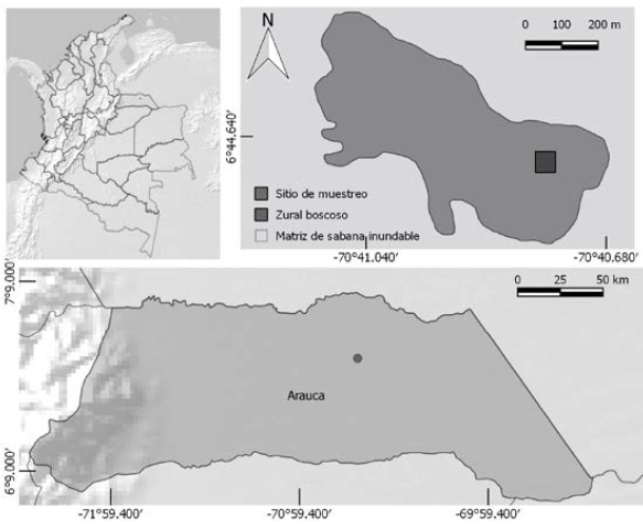 El estudio se realizó en un fragmento de 21.3 ha de un zural boscoso ubicado en el paisaje fisiográfico de sabana inundable en la zona rural del municipio de Arauca, Colombia (figura 1).