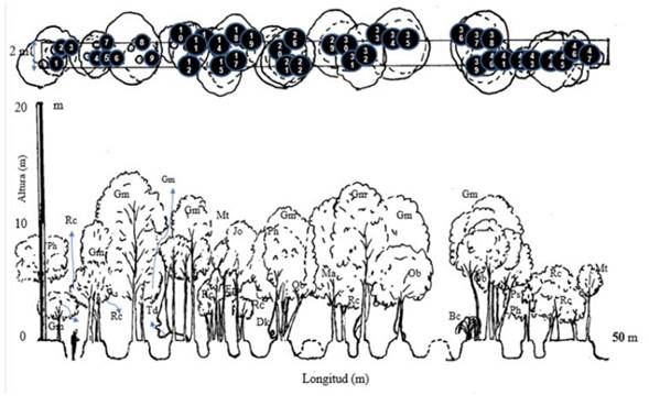 Se recolectaron muestras botánicas de las plantas encontradas en los transectos, que fueron herborizadas y depositadas en el Herbario Orinocense (Hori) de la sede Orinoquía de la Universidad Nacional de Colombia. Para la determinación taxonómica se emplearon claves, catálogos ilustrados, listas de especies y recursos virtuales (Gentry 1996; Mendoza y Ramírez, 2006; Duno de Stefano, Aymard y Huber, 2007; Hokche, 2008; Bernal, Gradstein y Celis, 2015; The Field Museum, 2018; JSTOR, 2018; The Plant List, 2018; Tropicos, 2018). Se elaboró el perfil de vegetación para representar la estructura vertical del estrato arbustivo y arbóreo del bosque a partir de información de un transecto en el que se estimaron los diámetros de las copas, las alturas totales y fustales, las coordenadas X y Y de los individuos encontrados al interior del transecto y observaciones propias para cada individuo (figura 2). Se calculó el índice de diversidad alfa de Shannon-Wiener (H´) y a partir de este valor se estimó el número efectivo de especies (Melo, 2002; Jost, 2006). Además, se calculó el índice de valor de importancia (IVI), el cual da a conocer la estructura forestal empleando los registros de abundancia, frecuencia y dominancia de cada especie para los estratos arbustivo y arbóreo; e independientemente para el estrato rasante usando la cobertura como medida de la dominancia (Finol, 1976). Por último, se empleó el programa Estimates para evaluar la calidad del muestreo (Colwell, 2013).