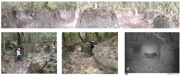 En el área de 0.1 ha se calculó una densidad de 97 zuros con un promedio de 9.7 zuros por cada 50 m de transecto. La altura promedio de los zuros fue 1.36 m (± 0.06 m, rango: 1.20-1.60, n = 97) y un diámetro promedio de 2.70 m (± 1.18 m, rango: 0.9-6.3, n = 97), separados por zanjas de 2.42 m (± 2.9 m, rango: 1.1-12.1, n = 97). En los montículos predominó vegetación leñosa (árboles, arbustos y lianas) y vegetación herbácea de poco tiempo de establecimiento, generalmente plántulas de las especies arbóreas y algunos helechos del género Adiantum (figura 3). En los canales o zanjas no se observaron plantas (figura 3a y 2b). Algunos zuros presentaban evidencia de actividad de lombrices y de hormigas acumulando tierra sobre los montículos lo que podría ser uno de los mecanismos que induce el levantamiento gradual del zuro (figura 3c).