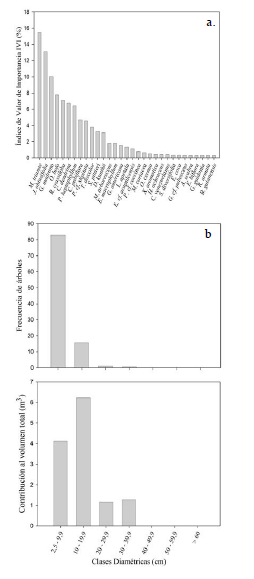 Respecto a las clases diamétricas en el zural boscoso el mayor número de árboles, lianas y arbustos se concentró en la clase diamétrica I (2.5 cm-9.9 cm) con 328 individuos (83%) (figura 4b). El restante 17% (68 individuos) fue para árboles con diámetros mayores o iguales a 10 cm. No se encontraron individuos con diámetros por encima de 40 cm. Respecto a la contribución del volumen total de madera en el zural boscoso, los 62 individuos de la clase diamétrica II (10-19.9 cm) contribuyeron con el 48.7% (6.23 m3), seguidos por los 328 individuos de la clase I (2.5-9.9 cm) que aportaron el 43.6% (4.12 m3). Los restantes individuos arbóreos (clases III y IV) aportaron el 19% del volumen total (1.16 m3, 1.26 m3, respectivamente). En relación al área basal, la clase diamétrica I con 328 individuos tuvo una contribución del 43.6%, seguido por la clase II de 62 individuos y un aporte del 41.1%.