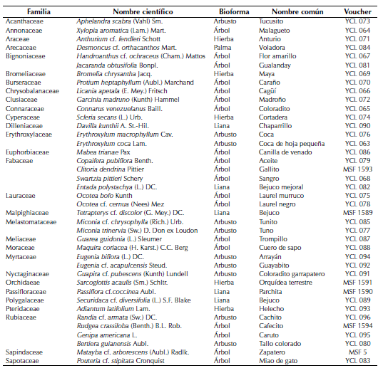 En el área muestreada de 0.1 ha se registraron 849 individuos, de los cuales 396 (46.6%) fueron plantas leñosas con DAP ≥2.5 cm representados en 22 familias, 28 géneros y 31 especies (tabla 1). En el estrato rasante y herbáceo se registraron 453 (53.4%) individuos de siete familias, ocho géneros y nueve especies. Las familias mejor representadas fueron Rubiaceae, con cuatro géneros y cuatro especies; Fabaceae (Leguminosae), con tres géneros y tres especies; Lauraceae, Bignoniaceae, Myrtaceae y Erythroxylaceae, con dos géneros y dos especies cada una. Las 16 familias restantes estuvieron representadas por un género y una especie lo cual indica una baja representación de ambas categorías taxonómicas para la mayoría de las familias encontradas. El hábito de crecimiento arbóreo fue el más abundante con el 47.5% de los individuos censados, seguido del arbustivo con el 25%, herbáceas y lianas con 12.5% cada una, y palmas con 2.5%.