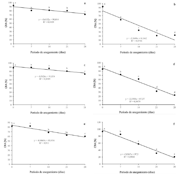 Ahora bien, J. neotropica (figura 5b), D. viscosa (figura 5e) y S. viarum (figura 5f) presentaron un aumento gradual con diferencias significativas entre los diferentes periodos de anegamiento, alcanzando valores superiores al 70 y 90%. Esto señala que, aunque las plantas pueden tener algún mecanismo para impedir el daño a nivel de membranas celulares, este no es suficiente y si el factor estresante no es retirado posterior a los 28 dda posiblemente se genere un daño irreversible a nivel de las estructuras celulares.