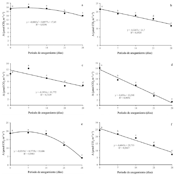 Las plantas de las seis especies se dejaron durante 20 días en proceso de aclimatación a las condiciones del semitecho y se generaron cuatro niveles de estrés por anegamiento: 7, 14, 21 y 28 días de anegamiento (dda). El anegamiento se generó en tres camas de 10 m de longitud, 1 m de ancho y 0.6 m de profundidad. Las camas fueron permeabilizadas con plástico negro y llenadas con agua potable. El nivel del agua siempre se mantuvo 10 cm por encima de la superficie del suelo de las plantas, que se ubicaron en las camas en sus respectivas bolsas de trasplante. El suelo contenido en las bolsas de trasplante tenía las mismas características físico-químicas en todos los tratamientos evaluados: presentaba una textura franco arcillosa y un contenido de carbono orgánico de 4.6%. Los muestreos se realizaron de forma aleatoria en cuatro plantas por tratamiento, con diferencial número de hojas analizadas dependiendo del tipo de parámetro a medir.