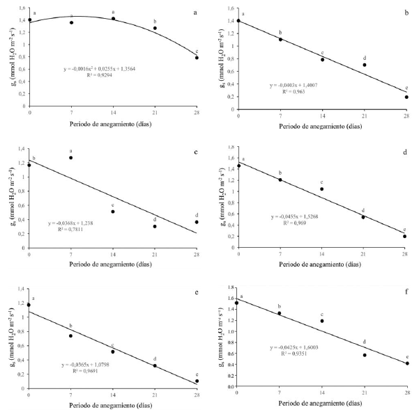 Con respecto a la conductancia estomática (gs), se presentó una disminución para todas las especies evaluadas a medida que el estrés aumenta. Para Q. humboldtii (figura 3a) y F. tequendamae (figura 3c), se presentaron diferencias estadísticas a partir de los 21 dda y los 14 dda respectivamente. Para J. neotropica (figura 3b), D. coerulea (figura 3d), D. viscosa (figura 3e) y S. viarum (figura 3f) se dieron diferencias estadísticas a partir de los 7 dda y en cada uno de los diferentes niveles de estrés por anegamiento. La conductancia estomática disminuyó drásticamente para todas las especies alcanzando valores de alrededor 0.2 mmoles H2O m-2s-1 en el momento de mayor estrés, excepto para Q. humboldtii, que presentó valores de 0.8 mmoles H2O m-2s-1 a los 28 dda.