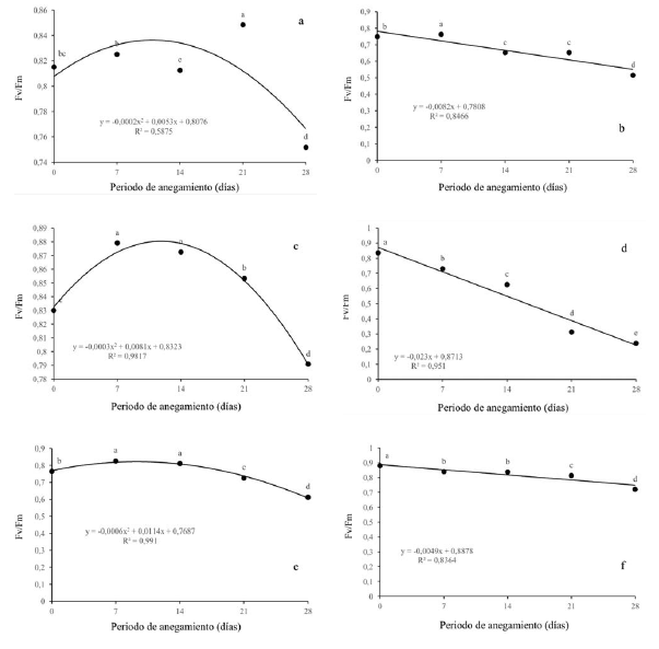 La eficiencia máxima del PSII se vio realmente afectada por las condiciones de anegamiento, principalmente para D. coerulea (figura 4d). que disminuyó drásticamente evidenciando graves daños a nivel del PSII, posiblemente por per-oxidación de la proteína D1 y que seguramente no puede ser sintetizada a la misma o a mayor velocidad comparado con la degradación a la que está siendo sometida por el nivel de especies reactivas de oxígeno en esta especie (Ohnishi et al., 2005; Nishiyama, Allakhverdiev y Murata, 2006; Andrade, Dázio, Santos, Silva y Donizeti, 2018).