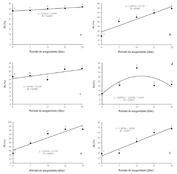 Con respecto a la pérdida de electrolitos se pudo evidenciar que no hubo diferencias estadísticas para Q. humboldtii (figura 5a). Para F. tequendamae (figura 5c), se presentó un leve aumento en la PE a partir de los 21dda. Con respecto a D. coerulea (figura 5d) se observó un aumento hasta los 14 dda pero la PE se disminuyó tanto a los 21 como a los 28 dda significativamente. Por otro lado, con respecto a J. neotropica (figura 5b), D. viscosa (figura 5e) y S. viarum (figura 5f), se presentó un aumento gradual con diferencias significativas entre los diferentes periodos de anegamiento, alcanzando valores superiores al 70 y 90% cuando las plantas fueron sometidas a 28 dda.