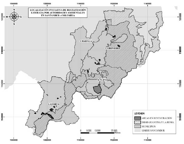 El proyecto de restauración se desarrolló en los municipios de Encino, Coromoro y Gámbita (Santander), localizados en el corredor de conservación Guantiva-La Rusia-Iguaque (figura 1), ubicado en la vertiente occidental de la cordillera Oriental, delimitado por la vertiente occidental del río Chicamocha, la oriental del río Suárez y ocupado por ecosistemas de bosques secos, subandinos, andinos, altoandinos y páramos (Sáenz-Jiménez, 2010).