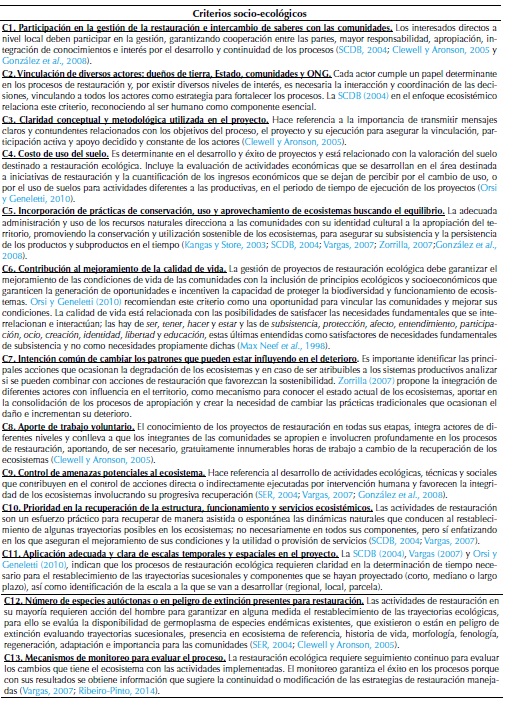 Para identificar los criterios, inicialmente se revisaron los 12 principios del enfoque ecosistémico (SCDB, 2004) y los atributos para determinar el logro de la restauración propuestos por la SER (2004); se tomaron los aplicables en una primera propuesta. Posteriormente, se revisaron recomendaciones para el desarrollo de proyectos de restauración hechas por Clewell y Aronson (2005), Vargas (2007), Zorrilla (2007), Orsi y Geneletti (2010) y Ribeiro-Pinto (2014) y se incluyeron las necesidades de las comunidades locales según lo propuesto por Max Neef, Elizalde y Hopenhayn (1998), Clewell y Aronson (2005), González, Montes, Rodríguez y Tapia (2008) y Orsi y Geneletti (2010).