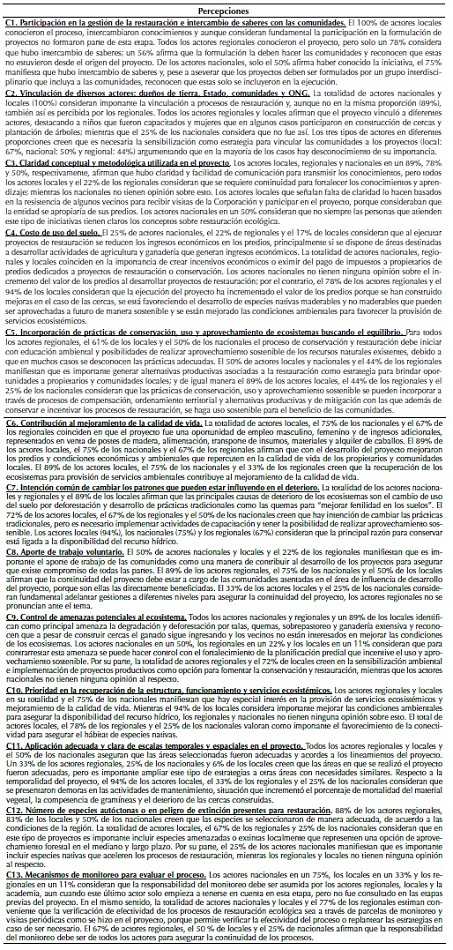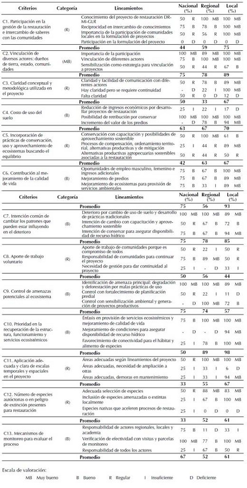 En el anexo 2 se incluyen las percepciones de los actores nacionales, regionales y locales, según los criterios identificados, lineamientos construidos y el papel que cada uno desempeñó en el proyecto. En la tabla 2 se presenta la evaluación de los criterios de acuerdo a las percepciones por tipo de actor según la escala de valoración definida que permite identificar los aspectos relevantes para cada actor desde el papel desempeñado en el proyecto. El criterio relacionado con la vinculación obtiene la mejor valoración porque los tres tipos de actores coinciden en afirmar que hubo posibilidad de formar parte de la ejecución del proyecto; en contraste, 6 de los 13 criterios definidos fueron valorados como buenos, lo que refleja un manejo adecuado de algunos aspectos socio-ecológicos y a diferencia de los anteriores, los restantes seis criterios fueron valorados como regulares, mostrando que hay aspectos fundamentales en el ejercicio de restauración que deben ser mejorados o fortalecidos para asegurar el éxito de los procesos.