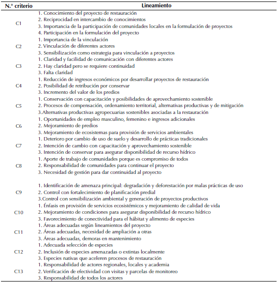 La prioridad en la recuperación de la estructura, funcionamiento y servicios ecosistémicos fue un criterio bien valorado porque existe un interés particular en la recuperación de áreas boscosas que en otrora conservaban características para el hábitat de la fauna, provisión de productos forestales maderables y no maderables y zonas de recarga hídrica que mantienen constantemente el flujo de agua para uso doméstico y agropecuario. Esto ratifica la fuerte relación existente entre los servicios ecosistémicos y la restauración también sugerida por Alexander et al. (2016) que, aunque en ocasiones muestra resultados solo a mediano o largo plazo, garantiza mayor productividad en los ecosistemas restaurados que en los degradados (Mills et al., 2015) y favorece la recuperación de servicios ecosistémicos como el agua, fijación de CO2, suelo, biodiversidad, control de erosión y a su vez contribuye en el mejoramiento de la calidad de vida de los pobladores a largo plazo (Vargas, 2011; Cabrera y Ramírez, 2014).