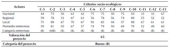 En la tercera etapa se realizó un análisis multicriterio, considerado como una herramienta para la toma de decisiones en la que se pueden incluir varios criterios relacionados con aspectos cualitativos o cuantitativos y de forma multidimensional (Munda, 1993; Mendoza et al., 1999). Se analizaron los datos sociales a partir del enfoque de principios y criterios (Mendoza et al., 1999), en este caso socio-ecológicos. Los criterios identificados fueron evaluados con la caracterización y cuantificación de los lineamientos por cada actor y los resultados incorporados siguiendo el modelo de matriz distributiva multicriterio planteada por Vargas-Isaza (2005). Para la estimación del valor de cada uno de los criterios se calculó el promedio generado de las percepciones por tipo de actor (tabla 2), posteriormente se estableció el promedio de las valoraciones de los actores en la matriz distributiva multicriterio (tabla 3). Del análisis multicriterio se obtuvo la valoración por criterio para cada actor y una valoración general del proyecto de restauración. Se estableció una escala de valoración relacionada con 5 categorías variables entre 0 y 100, así: deficiente (D): 0-19.9; insuficiente (I): 20-39.9; regular (R): 40-59.9; bueno (B): 60-79.9 y muy bueno (MB): 80-100.