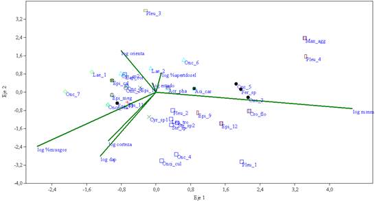 Aquellas relacionadas con la calidad del forófito: el porcentaje de cobertura de musgos, el dap y la corteza, las cuales explican gran parte de la variación. Teniendo el porcentaje de cobertura de musgos los mayores valores en los ejes 1 y 2, seguido del dap (diámetro a la altura del pecho) y la corteza. Este grupo de vectores son opuestos al vector de altura.