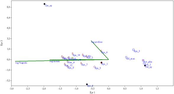 Los dos primeros ejes del ACC para epífitas (figura 1) representan el 83.45 % de la variación entre las especies y las condiciones ambientales. El ACC para especies terrestres (figura 2) muestra en sus dos primeros ejes el 100 % de la variación.