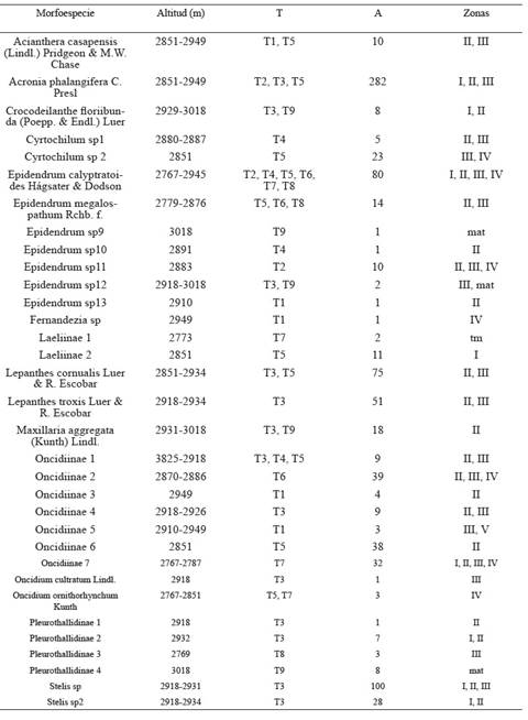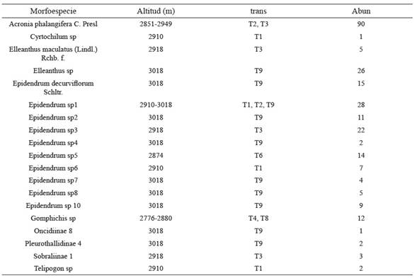 Las especies más abundantes fueron Acronia phalangifera, Stelis sp.1 y Epidendrum calyptratoides (tablas 1 y 2), siendo E. calyptratoides la especie encontrada con más frecuencia en los transectos (seis transectos), seguida de A. phalangifera, Epidendrum sp. 1, Epidendrum megalospathum y Oncidiinae 1, encontradas todas en tres de los transectos.