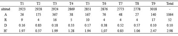 Se identificaron 55 morfoespecies (tablas 1 y 2), 16 a nivel de especie, 24 a nivel de género (Cyrtochilum Kunth, Elleanthus C Presl, Epidendrum L, Fernandezia Ruiz & Pav., Gomphichis Lindl., Stelis Sw y Telipogon Kunth) y 15 a nivel de subtribu y tribu (Laeliinae Benth, Oncidiinae Benth, Pleurothallidinae Lindl. ex G. Do y Sobralieae Pfitzer). Los valores para toda el área estudiada del índice de dominancia de Simpson y de Shannon fueron de 0.1 y 2.98, respectivamente.