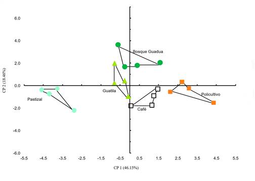 El primer paso consistió en realizar un análisis de varianza (Andeva), teniendo en cuenta el conjunto total de variables (16) fisicoquímicas y microbiológicas. Esta fase permitió excluir las propiedades que no presentaron diferencias estadísticamente significativas en respuesta a los diferentes manejos agrícolas en los agroecosistemas evaluados. Lo anterior se realizó con el programa SPSS Statistics® 24 2010 (v. 24, Chicago, IL). Solo los indicadores que mostraron diferencias estadísticamente significativas entre tratamientos (p ≤ 0.05) se seleccionaron para la matriz de datos total preliminar y determinar el CMD (Raiesi y Salek-Gilani, 2017). Seguidamente, se efectuó un análisis de similitud en una vía (Anosim -analysis of similarities por sus siglas en inglés-), esta corresponde a una prueba no paramétrica que permite determinar diferencias significativas entre dos o más grupos, basada en la medida de cualquier distancia (Ramette, 2007). En este caso, se determinó la similitud entre las distintas de las muestras de suelo para cada agroecosistema (grupos) a partir de las distancias de Bray-Curtis con una permutación de 9999. Para lo anterior, se empleó el programa estadístico Paleontological Statistics (PAST), versión 2.16 (Hammer, Harper y Ryan, 2012). El programa estadístico calculó el valor R, el cual denota disimilitud entre grupos si su valor se aproxima o sobrepasa a 1. La significancia estadística de dicho coeficiente se obtuvo mediante un proceso de aleatorización, y se optó por un valor referencial: p≤0.05; valores de R≤0.50 indicaron una débil separación entre los grupos comparados (Ramette, 2007). Los indicadores físicos, químicos y microbiológicos que presentaron diferencias significativas (Andeva, p ≤ 0.05) se sometieron a un ACP empleando una matriz de datos estandarizada (matriz de correlación) con el paquete estadístico FactoMineR (Lê, Josse y Husson, 2008) en el programa R (R Development Core Team, 2016).