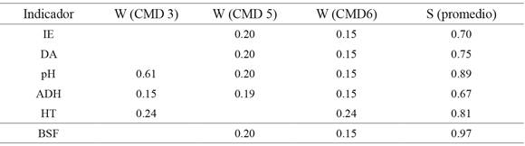 Donde W es el factor de peso dado por la variabilidad del CP correspondiente al indicador seleccionado sobre el total de la variación y S es la puntuación asignada a cada indicador, para establecer el índice de calidad de suelo correspondiente a todo el lote experimental. Cada CP explica cierto porcentaje de la variación en el CMD; este porcentaje es dividido por el total de la variación explicada en el CP seccionado para ese indicador en el CMD (si la variación de un CP usaba varios indicadores, ese valor se dividió por el número total de indicadores correspondientes), dando así el factor de peso (W), dependiendo del número de indicadores en el CMD, peso asignado cambiaba (tabla 1), también se muestra el promedio de puntuación asignado para cada indicador. Para ver las diferencias de los ICS calculados entre sistemas productivos (SP) se realizó un análisis de varianza (Andeva, p≤0.05) y para evaluar si existían diferencias entre las variables en los diferentes agroecosistemas y en los tres CMD seleccionados se realizó una prueba de kruskal wallis (p≤0.05), usando programa R (R Core Team, 2016).