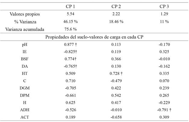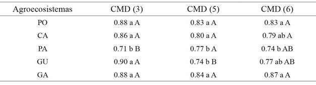 Los tres primeros CP presentaron valores propios > 1 y explicaron el 75 % de la varianza total de los datos. El primero explicó el 46 % de la variación, el segundo el 17 % y el tercero el 12 %; de la misma forma, los valores propios disminuyeron del CP 1 al CP 3 (tabla 3). Los resultados indican que los tres primeros CP expresaron efectivamente los cambios totales de la calidad de suelo en los agroecosistemas comparados. Los CMD se conformaron por las siguientes variables: para el primer CMD de seis variables: DA, IE, pH, ADH, HT y BSF; el segundo grupo se constituyó por cinco variables: DA, IE, pH, ADH y BSF; y para el tercer y último CMD se tuvieron en cuenta el pH, la ADH y los HT. Es importante resaltar que independiente del CMD las variables que siempre se conservaron fueron el pH y la ADH (tabla 3).