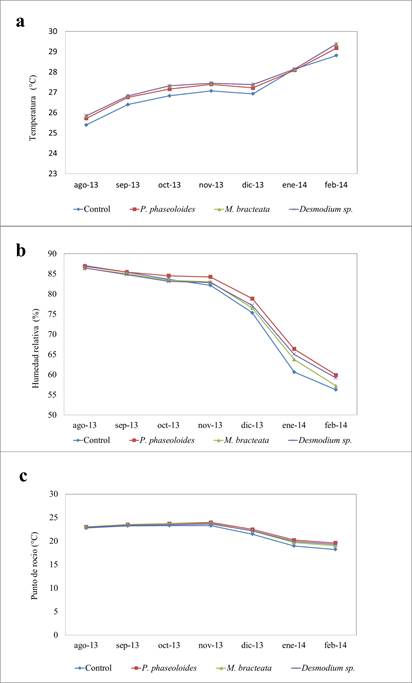 Durante los meses de evaluación la temperatura diaria presentó una tendencia similar en los tratamientos (figuras 1a a 1c) (Levene p=0.979, F=2.271, p=0.079) señalando poca diferencia en el tiempo evaluado. No obstante, el tratamiento Mucuna presentó diferencias con el control para los valores diarios (Dunnet p=0.031).