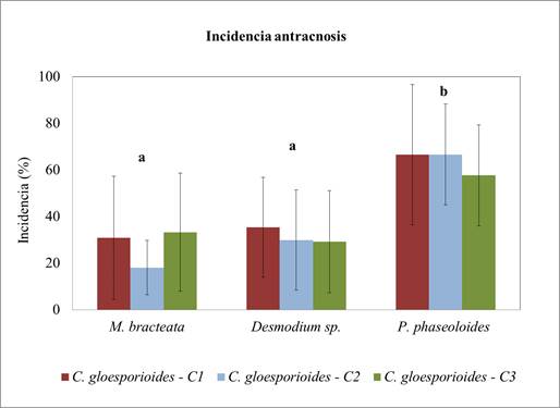 Los síntomas observados correspondieron a manchas necróticas; lo que posteriormente se confirmó eran causadas por C. gloesporioides mediante aislamiento desde las hojas con la sintomatología, verificación microscópica y molecular (datos no mostrados). La incidencia de la enfermedad fue menor en M. bracteata y Desmodium sp. que en P. phaseoloides (p=0.00, F=15. 95; figura 5). No se encontraron diferencias significativas (p=0.84, F=0.174) en cuanto a la incidencia de la enfermedad causada por cada uno de los aislamientos (figura 4), es decir, no hubo evidencia de diferencia en cuanto a la virulencia de los aislamientos.