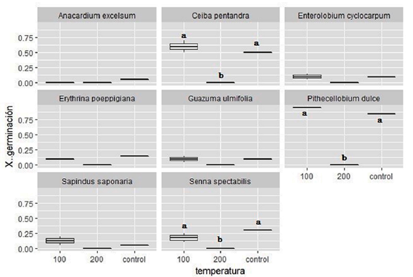 En general, la germinación de las semillas de siete de las ocho especies, así fuera baja, fue similar para el control y bajo la temperatura de 100°C, lo que indica que la mayoría de las especies utilizadas demostró tolerancia a los tratamientos de baja incidencia. En contraste, la germinación de las ocho especies fue casi nula bajo el tratamiento de 200°C (a excepción de una semilla de Sapindus saponaria), lo cual sugiere que la mayoría de las especies no germinaría en presencia de incendios de alta intensidad.