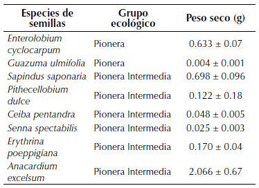 Cabe resaltar que estas tres especies son pioneras intermedias y tienen semillas que pesan menos de 1 gramo (tabla 1), lo cual, según Romero-Saritama y Pérez-Ruiz (2016) indica que tienen una tendencia ortodoxa. Es decir, que poseen bajos contenidos de humedad y una testa dura-impermeable, lo cual restringe la pérdida de humedad y, por consiguiente, son más resistentes a altas temperaturas (Gómez-González, Torres-Díaz, Bustos-Schindler y Gianoli, 2011).