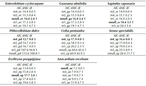 Para definir la plausibilidad de las variables evaluadas en el experimento se utilizó el criterio de información de Akaike (AIC) (Akaike, 1974), el cual evalúa y compara el poder de predicción de un conjunto de modelos estadísticos entre sí, estimando el que mejor se ajuste a los datos (Burnham y Anderson, 2003). Este criterio se utiliza para definir cuál de los modelos tiene el mejor ajuste con el valor de dAIC, es decir, la diferencia entre el valor de AIC de un modelo y el valor más bajo de todos los AIC. Por lo tanto, en la escala relativa de plausibilidad, los modelos con valores de dAIC en un intervalo entre 0 y 4 (rango que reduce el error tipo I), son los modelos con máxima verosimilitud para los factores que se escogieron. Considerando que los dAIC de la mayoría de los modelos se encontraban dentro de este rango (anexo 1), se utilizó el principio de parsimonia para seleccionar el modelo con menos factores que pudiera explicar la variación de los datos (Burnham y Anderson, 2003). Finalmente, se comparó la proporción de germinación para cada especie utilizando un test de proporciones de 2-muestras, el cual se concentra en establecer las diferencias que hay entre dos muestras (en este caso, la diferencia de germinación entre tratamientos). De esta manera, se evaluó si existían diferencias significativas en la germinación de semillas entre los tratamientos experimentales de control, T100, T200 utilizando un alfa (α) de 0.05.