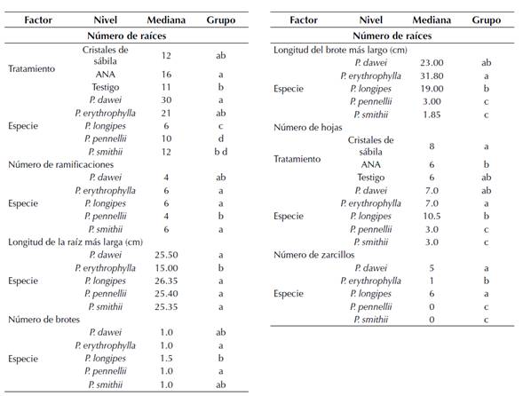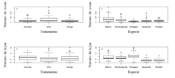 Aunque no hubo diferencias significativas entre los tratamientos, el número de raíces por estaca fue mayor cuando se aplicó ANA en comparación con la aplicación de cristales de sábila y el testigo, y no hubo una diferencia significativa en el número de raíces por estaca para las que fueron tratadas con cristales de sábila (Aloe vera) y las testigos (figura 1a). En cuanto a la especie, P dawei y P erytrophylla reportaron las producciones más altas de raíces en comparación con P. longipes, la cual presentó la menor cantidad de raíces (figura 1b).