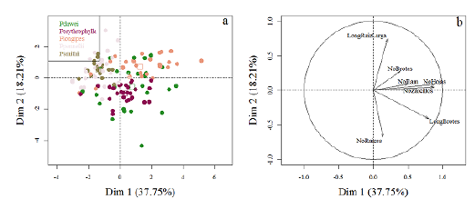 Las estacas de las especies P. pennelli y P. smithii tuvieron un desarrollo similar debido a que ocuparon un espacio semejante en el plano factorial, el cual indica valores bajos tanto en la dimensión uno (baja construcción de tejidos aéreos) como en la dimensión dos (baja construcción de tejidos subterráneos). Sin embargo, su desarrollo se caracterizó por la producción de un bajo número de raíces largas (figura 2, anexo 1). P. longipes mostró un mayor desarrollo de tejidos aéreos en comparación con los subterráneos, lo cual se evidencia en valores altos para la dimensión uno y bajos para la dos, puesto que en esta última primó la construcción de pocas raíces largas (figura 2, anexo 1). Para P. erythrophylla, la inversión en tejidos aéreos fue mayor que en tejidos subterráneos dando prioridad a un mayor número de raíces cortas y brotes largos (figura 2, anexo 1). Finalmente, las estacas de P. dawei tuvieron la mayor variación en el plano factorial para ambas dimensiones, sin embargo, esta especie mostró crecimiento de brotes largos, de pocas hojas y raíces abundantes y largas durante su desarrollo (figura 2, anexo 1).