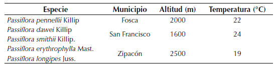 El montaje experimental fue realizado en el vivero del JBB, ubicado en la localidad de Engativá (Bogotá, Colombia), con una altitud de 2650 m y temperaturas que al interior del vivero alcanzan 22°C. El muestreo y recolección de material vegetal de las especies de Passiflora endémicas y amenazadas fue realizado en los municipios Fosca, San Francisco y Zipacón en el departamento de Cundinamarca. Los sitios muestreados se encontraban entre los 1600 y 2500 m de altitud y 19 a 24°C de temperatura media y contaban con una vegetación transformada dentro de fincas y aledaña a carreteras y fuentes de agua (tabla 1). Para cada especie muestreada se tomaron ejemplares botánicos que fueron depositados en el Herbario del JBB.