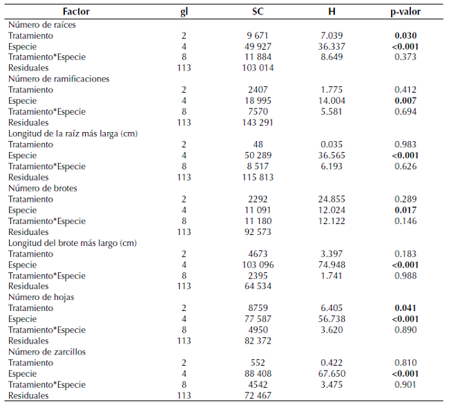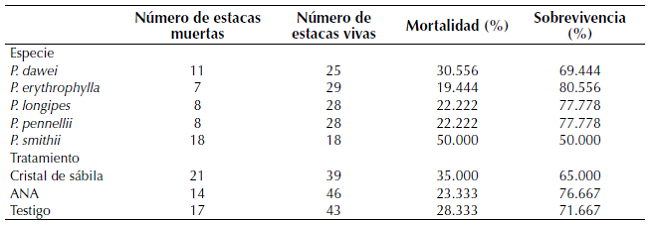 No se encontraron diferencias entre el porcentaje de sobrevivencia y mortalidad de las estacas entre las especies (sobrevivencia K-W x2: 4, p-valor: 0.406; mortalidad K-W x2: 4, p-valor: 0.406) o entre los tratamientos (sobrevivencia K-W x2: 2, p-valor: 0.368; mortalidad K-W x2: 2, p-valor: 0.368). Sin embargo, las estacas con mayor mortalidad correspondieron a las especies P. dawei y P. smithii y aquellas que fueron tratadas con cristales de sábila (tabla 2).