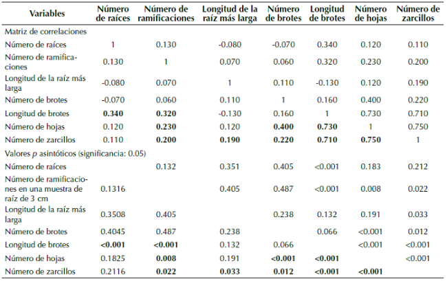 Las variables medidas en las estacas variaron de acuerdo con la especie de Passiflora (tabla 2, anexo 1) y para algunas se observaron correlaciones (anexo 2). En el ACP la primera dimensión estuvo correlacionada con el número de hojas (0.884. p-valor: <0.001), el número de zarcillos (0.874. p-valor: <0.001), la longitud del brote más largo (0.797. p-valor: <0.001), el número de ramificaciones (0.501. p-valor: <0.001) y el número de brotes (0.390. p-valor: <0.001) que, de manera general, representan la construcción de tejidos aéreos en la etapa de desarrollo de la estaca; la segunda dimensión estuvo correlacionada con la longitud de la raíz más larga (0.745. p-valor: <0.001), la longitud del brote más largo (-0.410. p-valor: <0.001) y el número de raíces por estaca (-0.677. p-valor: <0.001), lo que representa la construcción de tejidos subterráneos. Ambas dimensiones acumularon una varianza de 55.95 % (figura 2).