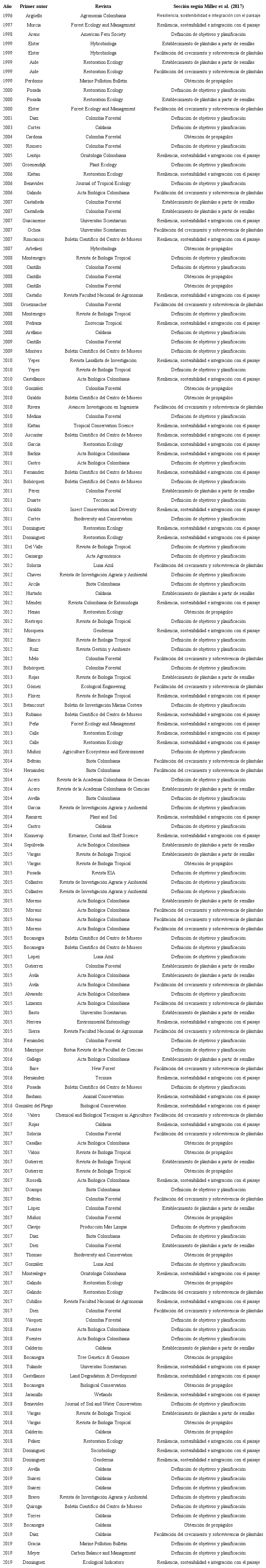 Las publicaciones fueron clasificadas según la propuesta de Miller et al. (2017). Esta propuesta surge como resultado de la poca efectividad de algunos programas de restauración, debida a su vez a la poca correspondencia entre las necesidades de la práctica de la restauración y la ecología de la restauración. Adicional a esto, seleccionamos esta propuesta o marco de trabajo pues incluye aspectos de la mayor importancia pero que probablemente están ausentes de la mayoría de proyectos en Colombia. Por ejemplo: el aprovechamiento de la regeneración natural y de la siembra como estrategias de restauración, la diversidad genética, la consideración del compartimiento suelo, el papel del área intervenida en la conectividad y la evaluación de la resiliencia del área restaurada.