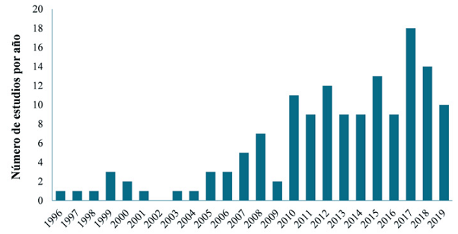 Encontramos un total de 143 estudios publicados a partir de 1996; siendo la mayoría (79 %) publicados a partir de 2010 (figura 1; anexo 1). Dado que 21 artículos abordaron dos o más temas, el análisis se hizo sobre 167 casos. Las fases tratadas con mayor frecuencia fueron la “Definición de objetivos y planificación para la restauración”, junto con “Resiliencia, sostenibilidad e integración del ecosistema en restauración”, con 59 y 42 casos, respectivamente. Las otras tres fases: “Obtención de propágulos”, “Establecimiento de plántulas a partir de semillas” y “Crecimiento y sobrevivencia de plántulas en campo”, se abordaron con menor frecuencia, en 20, 22 y 23 casos, respectivamente (figura 2). “Establecimiento de plántulas a partir de semillas” fue la fase que se trató con mayor frecuencia en aquellos artículos que exploraron más de un tema (10 estudios). “Almacenamiento de semillas” y “Condiciones físicas, químicas e hidrológicas del sustrato y su manipulación” fueron los temas más recurrentes con los que se combinó “Establecimiento” en este tipo de estudios.