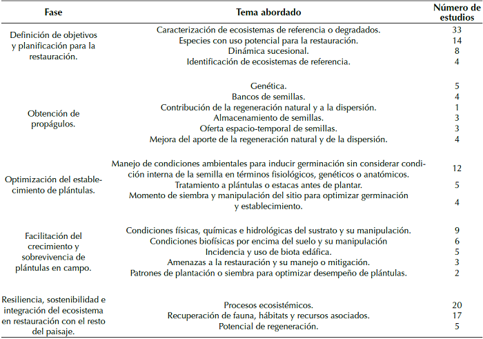 La proporción de publicaciones es similar para genética de poblaciones, bancos de semillas y mejoras al aporte de la regeneración y la dispersión dentro de la fase de obtención de propágulos. El almacenamiento y oferta espacio-temporal de semillas, junto con la evaluación de la regeneración y la dispersión, se abordaron en menor proporción. Germinación controlando factores ambientales es el tema predominante para la fase de optimización del establecimiento de plántulas. Dentro de esta fase también aparecen, pero en menor frecuencia, el tratamiento de las plántulas o estacas antes de plantar y manipulación del sitio de siembra para optimizar la germinación y el establecimiento. La evaluación y manipulación del sustrato es el tema más recurrente dentro de las publicaciones que exploraron la facilitación del desempeño de plántulas en campo. Otras publicaciones relacionadas con este tema se centraron en las condiciones microclimáticas (por ejemplo: competencia por luz y clima), así como incidencia y uso de biota edáfica, amenazas a la restauración y patrones de siembra y plantación (tabla 1).