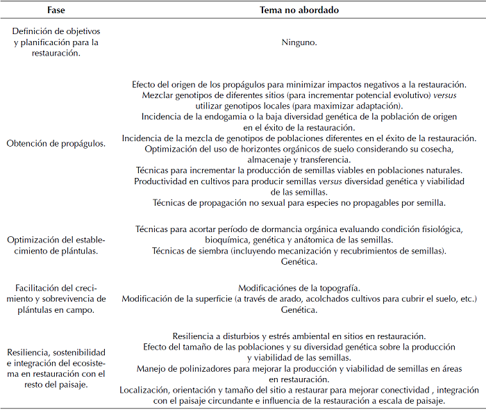 En cuanto a la obtención de propágulos, no se encontraron estudios sobre el uso de horizontes orgánicos de suelo y sus técnicas de almacenaje y transferencia. Tampoco hay publicaciones acerca de mejoramiento de producción de semillas en poblaciones naturales, producción de semillas ex situ ni técnicas de propagación asexual. No hay publicaciones sobre técnicas para superar dormancia orgánica (Baskin y Baskin, 2014) ni publicaciones sobre técnicas de siembra como parte de la optimización en el establecimiento de plántulas. Tampoco se han publicado trabajos que asocien la modificación de la topografía o la modificación de la superficie del suelo con el crecimiento y sobrevivencia de material plantado. Así mismo, aún no se publican estudios que evalúen la resiliencia en ecosistemas en restauración después de disturbios (o bajo estrés ambiental) ni se han publicado trabajos sobre el papel de polinizadores en la producción y viabilidad de semillas en estos sitios. Otro aspecto sobre el que no encontramos publicaciones es el posible impacto o el impacto real de un sitio en restauración en la matriz paisajística circundante (tabla 2).