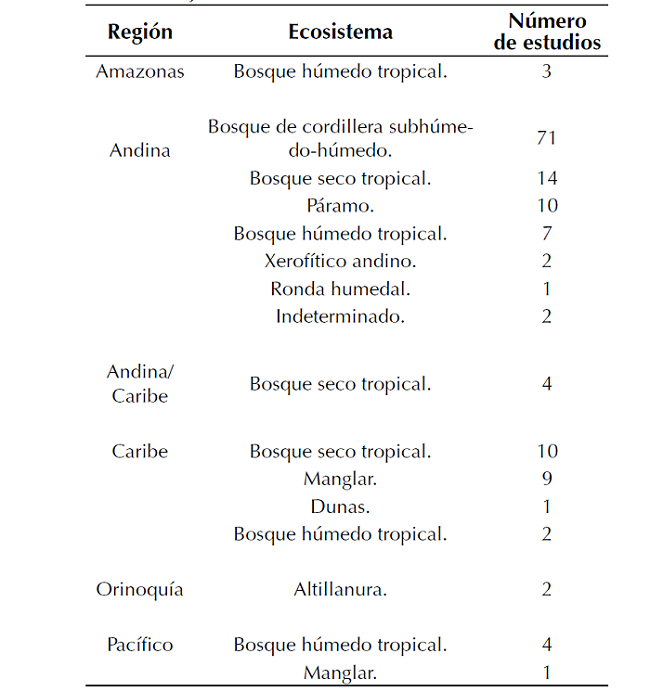 Por otro lado, se ha investigado con mucha mayor frecuencia en las regiones Andinas y Caribe, por lo que se identifica que ello va en consecuencia con el grado de transformación de dichas regiones. Sin embargo, la tasa de deterioro actual y la severidad de las alteraciones hacen necesario que se haga más investigación en las regiones de la Amazonia, Orinoquia y Pacífico, teniendo como base el marco a partir del cual se desarrolló el presente trabajo.