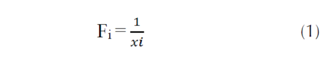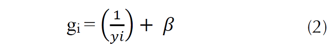 donde, gi representa la frecuencia de interacción del ave esperada, yi representa el valor del tamaño del pico y β es un parámetro de subcompensación, en el cual la frecuencia de interacción disminuye menos rápidamente cuan más grande es el tamaño del ave establecido en el 10 % del valor máximo de 1/y (Donoso et al., 2017).