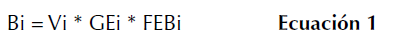 Bi: biomasa aérea de la especie i (kg.ha-1); Vi: volumen de la especie i (m3.ha-1); GEi: gravedad específica de la madera de la especie i (kg.m-3); FEBi: factor de expansión de biomasa de la especie i.