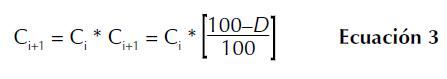 Ci+1 : carbono almacenado en el año i + 1 (Gg CO2) en el escenario de referencia, considerando el área boscosa total; Ci: carbono almacenado en el año i (Gg CO2); D: tasa anual de deforestación (%).