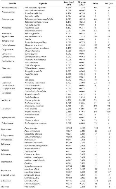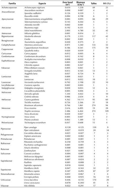 Los valores de densidad de madera para el cálculo de biomasa se obtuvieron del Global Wood Density Database (Zanne et al., 2009), a excepción de Sabal mauritiiformis, cuyo valor se obtuvo de Álvarez et al. (2013). En el caso de especies de lianas de las que no se encontró información, se adoptó un valor estándar de 0.4 g.cm-3 (Putz, 1990). Utilizando dos ecuaciones alométricas, se calculó la biomasa aérea para lianas (Schnitzer et al., 2006) y árboles (Chave et al., 2014). Se escogieron estas ecuaciones dada su robustez a lo largo de distintos ecosistemas boscosos y condiciones bioclimáticas, y en el caso de las lianas, debido a su aplicabilidad a los diversos tipos de lianas encontrados en el bosque.