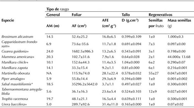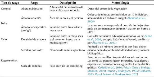 Se seleccionaron las especies cuya abundancia relativa acumulada en la parcela sumara aproximadamente el 80 % para la medición de los rasgos funcionales. De cada especie se escogieron 10 individuos de altura superior a la media por especie y de cada uno se colectaron 6 hojas que estuvieran expuestas al sol (Pérez-Harguindeguy et al., 2013). A continuación, se midieron 4 tipos de rasgos: generales, foliares, del tallo y regenerativos (Tabla 1). Luego, a partir de los datos de rasgos por especie, se calcularon los índices de diversidad funcional, utilizando la media ponderada por comunidad y estandarizando los datos para equilibrar sus varianzas. Cabe mencionar que el análisis de la diversidad funcional se realizó en el programa FDiversity, versión 2014 (Casanoves et al., 2010). Los Índices calculados fueron el rRao (rao relativo), como un medidor relativo de la diversidad general, y los índices funcionales Fric (riqueza funcional, el espacio funcional ocupado por la comunidad), Feve (igualdad funcional, la regularidad de la distribución de las abundancias de las especies en el espacio funcional), Fdiv (divergencia funcional, la divergencia de las abundancias de las especies al centroide del espacio funcional), Fdis (dispersión funcional, distancia promedio de cada especie y sus rasgos al centroide) y Fspe (especialización funcional, el promedio de la especialización de las especies dentro de la comunidad) (Casanoves et al., 2010;Villéger et al., 2010).