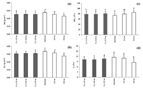 Planting spacing had no significant effect on any physical properties (Table 2 and Figures 1a, 1b, 1c, and 1d). As for the anatomical properties, the vessel diameter was significantly higher with a 3 x 2.5 m spacing than with 3 x 1.5 m (Table 2 and Figure 2a). However, the vessel frequency with a 3 x 2 m spacing was significantly higher than with 2 x 1.5 and 3 x 2.5 m (Table 3 and Figure 2b). Regarding the fiber length and the fiber wall thickness, no significant differences were observed among the three spacings (Table 2 and Figures 2c and 2d).