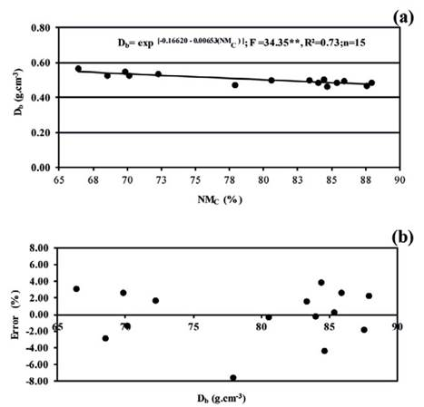 According to the regression model, a correlation was identified between the increase in wood basic density and the decrease in natural moisture content (Figure 3). In a Eucalyptus saligna plantation, Lopes & Garcia (2002) also confirmed the viability of estimating the wood basic density by determining the natural moisture content. While studying coniferous trees, Dibdiakova & Vadl (2012) found that the proportion of living tissues and sapwood increased from the base to the tree top, thus resulting in an increase in wood moisture content. The same authors observed that moisture content and wood density were inversely proportional. Furthermore, while studying Astronium gravelolens, Santos et al. (2011) found a good correlation between density and fiber wall thickness, which indicates that this correlation must benefit individual growth and cambium maturation, thus allowing for a balance between water conduction and mechanical resistance. The inverse correlation between the basic density and natural moisture content of the tree implies synchrony among wood properties.